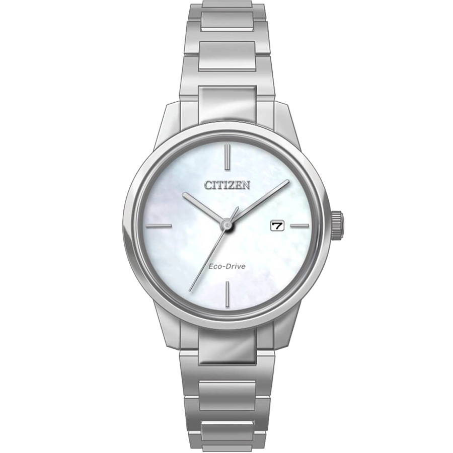 Đồng hồ nữ Citizen EW2590-85D chinh phục trái tim phái đẹp với vẻ ngoài đơn giản nhưng vẫn rất sang trọng của mình. Nổi bật trên tổng thể trắng bạc ở toàn bộ sản phẩm từ bộ case và dây đeo bằng thép không gỉ 316L chính là mặt số khảm xà cừ độc đáo mang lại hiệu ứng ánh sáng trên mỗi góc nhìn. Tất cả các chi tiết của dial đều được tối giản, đề cao tính thẩm mỹ trong nghệ thuật chế tác của Citizen. Ô lịch ngày ở góc 3h quen thuộc, dễ nhìn. Thiết kế 3 kim mảnh càng làm tăng thêm sự nhẹ nhàng, trang nhã của EW2590-85D. Logo Citizen và ký hiệu Eco-Drive được chạm khắc tinh tế, mang tính thẩm mỹ cao. Bao phủ trên mặt số là lớp kính sapphire có độ trong suốt cực cao giúp quan sát rõ hiệu ứng của mặt số khảm xà cừ, đồng thời, có khả năng chống xước gần như tuyệt đối, giúp các nàng hoàn toàn yên tâm trong quá trình sử dụng. Trau chuốt ở ngoại hình, EW2590-85D còn được Citizen chú trọng đến chất liệu khi được trang bị bộ máy Eco-drive độc quyền của hãng, sử dụng nguồn năng lượng xanh như ánh nắng mặt trời, ánh sáng nhân tạo, chuyển hóa thành năng lượng để cung cấp cho mọi hoạt động trực tiếp của đồng hồ, phần còn lại được chuyển vào viên pin để dự trữ. Với mỗi lần sạc đầy, chiếc đồng hồ này có thể hoạt động lên đến 8 tháng trong điều kiện không có ánh sáng và viên pin dự trữ có tuổi thọ đến 10 năm, hạn chế được một lượng lớn pin thải ra hàng năm, góp phần bảo vệ môi trường. Mức chịu nước của EW2590-85D đạt mốc 5ATM, cho phép phái đẹp có thể dễ dàng sử dụng trong các hoạt động thường ngày như rửa tay, đi mưa…