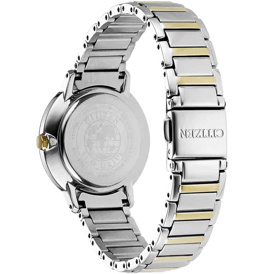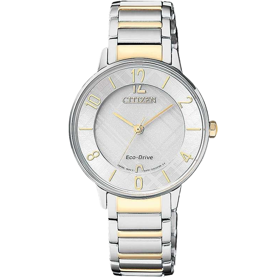 Một chiếc đồng hồ vừa có vẻ đẹp đầy tinh tế và lịch lãm ở bên ngoài, mà lại mang trong mình một trong những bộ máy tiên tiến và hiện đại nhất hiện nay, đó là những gì ngắn gọn nhất để miêu tả về sản phẩm Citizen Eco Drive EM0524-83A dành cho phái đẹp. Lựa chọn tông màu sáng và sử dụng màu sắc linh hoạt và thông minh giúp cho EM0524-83A trở nên một món phụ kiện lấp lánh trên cổ tay phái đẹp. Mặt số được thiết kế tỉ mỉ với hai lớp riêng biệt có màu sắc khác nhau, khi phần ở bên dưới có tông màu xám đậm hơn thì bên trên lại hướng theo sự trắng trang nhã. Bên cạnh đó, tại khung hai mốc 12h và 6h được làm cách điệu trên và dưới mang đến làn gió mới cho EM0524-83A. Bộ cọc số đan xen giữa chữ và vạch kẻ tượng trưng cùng bộ kim thanh mảnh đều được phủ một lớp mạ vàng bóng bẩy giúp tăng thêm sự sang trọng và hấp dẫn cho sản phẩm. Bảo vệ toàn bộ là lớp kính cường lực có khả năng chống xước và hạn chế va đập, tạo tầm nhìn tốt cho người sử dụng. Bộ case và dây đeo của EM0524-83A được chế tác từ chất liệu thép không gỉ 316L giúp đồng hồ luôn bóng bẩy ở mọi góc nhìn. Ngoài ra, dây đeo cũng được Citizen tỉ mỉ chọn phong cách thiết kế demi với sự phối hợp giữa hai sắc vàng và bạc hợp xu hướng và tăng tính thời trang cho sản phẩm. Đúng như tên gọi của bộ sưu tập, EM0524-83A được ưu ái trang bị bộ máy năng lượng ánh sáng, hoạt động bằng cách sử dụng nguồn năng lượng xanh do chính thiên nhiên ban tặng sau đó chuyển hóa thành dạng năng lượng để cung cấp cho mọi hoạt động trực tiếp của đồng hồ, phần còn lại được chuyển vào pin để dự trữ. Đây là một tính năng vô cùng tuyệt vời giúp cho bạn gần như không bao giờ phải đắn đo suy nghĩ, về việc hết pin bất ngờ trong quá trình sử dụng. EM0524-83A sở hữu đường kính mặt số 32mm cùng độ chống nước đạt 5ATM đủ để các nàng có thể tiếp xúc với nước như rửa tay, đi mưa hay đi tắm mà không ảnh hưởng đến chất lượng đồng hồ.
