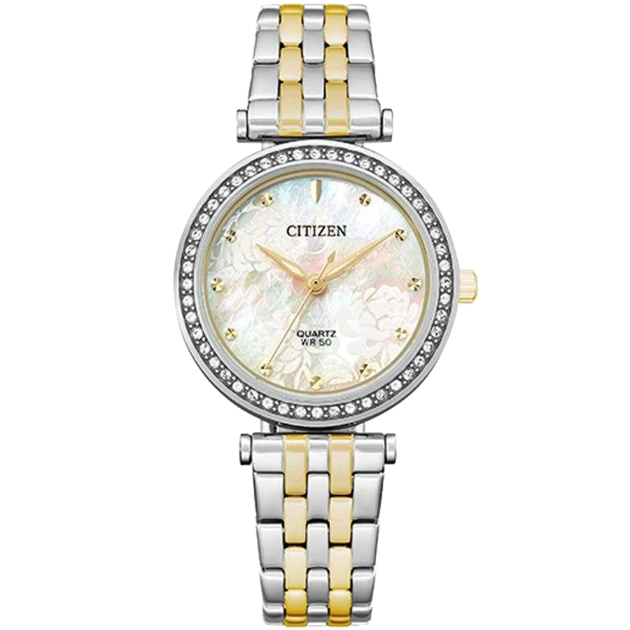 Citizen ER0214-54D không chỉ gây ấn tượng mạnh với danh tiếng lẫy lừng về một thương hiệu hàng đầu tại Nhật Bản mà còn tạo được sự thu hút nhờ những thiết kế bắt mắt, chất lượng. Ngay từ cái nhìn đầu tiên, ER0214-54D mang đến cho người dùng cảm nhận về một vẻ đẹp cao cấp, đầy kiêu sa. Nền mặt số không chỉ đơn giản là lớp xà cừ mang tone màu trắng bắt mắt mà những nghệ nhân tài ba đã tinh tế chèn thêm những họa tiết bông hoa giúp mặt số trở nên như một bức tranh nghệ thuật đặc sắc. Bộ cọc số dạng chấm tròn nhỏ kết hợp với bộ kim được tạo hình thanh mảnh mang đến cho sản phẩm sự ngọt ngào, nữ tính. Phần khung niềng bên cạnh việc được hoàn thiện từ thép không gỉ 316L còn được đính những viên đá pha lê lấp lánh giúp đồng hồ luôn giữ được vẻ sáng bóng ở mọi góc nhìn. Bảo vệ mặt số là mặt kính Mineral Crystal làm từ những tinh thể khoáng mang đến trải nghiệm xem giờ rõ nét cho người dùng. Để tôn thêm sự thanh lịch cho tổng thể, ER0214-54D sử dụng bộ dây kim loại với thiết kế demi hiện đại cùng công nghệ mạ màu PVD giúp lớp màu khó bị bong tróc bởi thời gian cũng như dễ dàng vệ sinh, làm sạch. Trái tim của ER0214-54D là bộ máy quartz chuẩn Nhật bền bỉ và chính xác, đồng thời cũng giúp cho sản phẩm có độ mỏng khá ẩn tượng chỉ 7mm. ER0214-54D sở hữu đường kính mặt số 310mm cùng độ chống nước đạt 5ATM đủ để các nàng có thể tiếp xúc với nước như rửa tay, đi mưa hay đi tắm mà không ảnh hưởng đến chất lượng đồng hồ.
