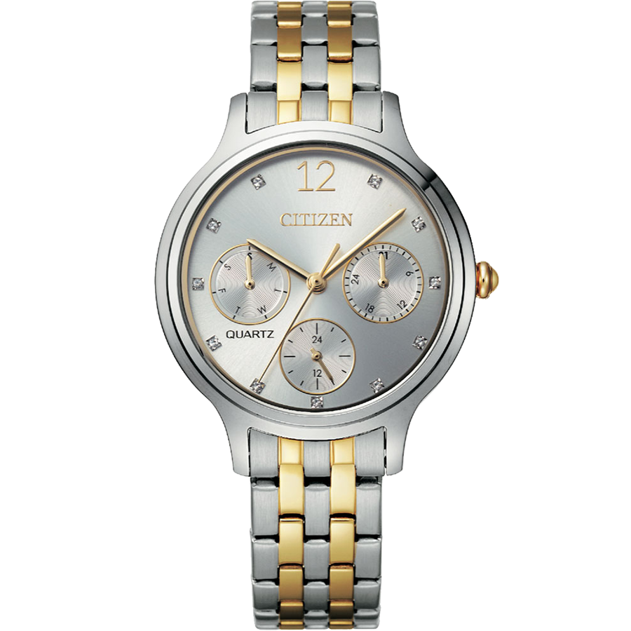 Kể từ khi ra mắt, đồng hồ nữ Citizen ED8184-51A đã ghi điểm trọn vẹn với các quý cô khi mang vẻ đẹp sang trọng, bắt mắt và có thể tạo thành tâm điểm trên cổ tay cho bất kỳ ai. Sự tinh tế và tỉ mỉ được Citizen dành cho ED8184-51A được thể hiện khéo léo trong cả những chi tiết nhỏ nhất. Sở hữu dây đeo demi tông trắng - vàng cùng bộ case bằng chất liệu thép không gỉ 316L giúp cho đồng hồ luôn giữ được vẻ bóng bẩy ở mọi góc nhìn. Mặt số tròn truyền thống cùng kích thước đường kính là 33mm, con số vừa đủ để đội ngũ thiết kế có thể thỏa sức sáng tạo nên những đường nét tinh tế đầy thu hút cũng như giúp nàng có được cảm giác thoải mái khi đeo trên tay một thời gian dài. Trên nền mặt số trắng bạc, bộ kim phủ màu vàng đồng cùng các cọc số là những viên đá lấp lánh vừa tạo điểm nhấn vừa thêm phần nữ tính cho chủ nhân. Ngoài ra, ED8184-51A cũng được trang bị thêm ba mặt số phụ chỉ thứ, ngày và 24h được bố cục hài hoà giúp cho các nàng kiểm soát thời gian tốt để chủ động trong công việc và cuộc sống. Bảo vệ mặt số là lớp kính cường lực có khả năng chịu lực, chống va đập tốt, ít bị ảnh hưởng khi va chạm. Sản phẩm được trang bị bộ máy quartz chính xác và bền bỉ, hoạt động bằng pin nên rất được các cô nàng tin dùng vì sự tiện lợi. ED8184-51A có độ chống nước tiêu chuẩn 3ATM cho phép phái đẹp đi mưa nhỏ, rửa tay khi sinh hoạt.
