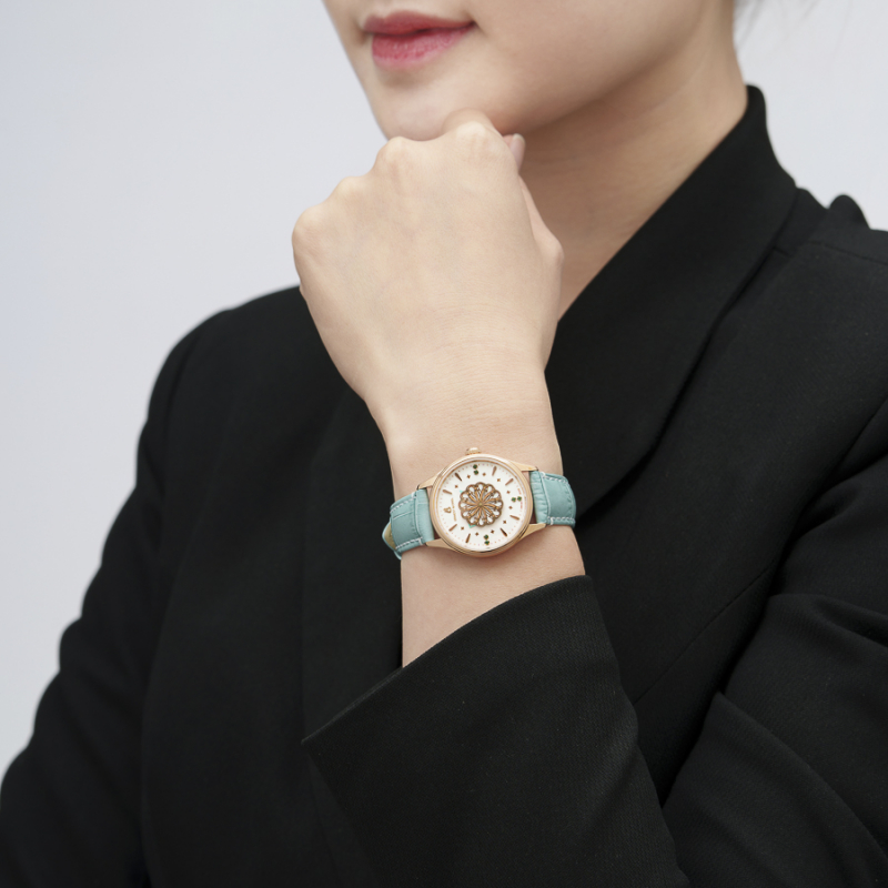 Các kim đồng hồ được thiết kế nhỏ gọn với ảnh xanh tích hợp mặt hoa kim loại sắc nét, kết hợp nền mặt số sáng bóng, mang lại khả năng hiển thị giờ vừa tinh tế vừa nghệ thuật.