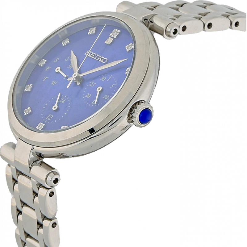 Dial của SKY661P1 mang màu xanh bắt mắt, thời trang, có đường kính 32,5mm, vừa vặn với cổ tay của phái đẹp. Trên dial này, các cọc số được Seiko lựa chọn để trở thành điểm nhấn cho người đeo khi đính lên đó 12 viên đá quý lấp lánh, cao cấp. Các mặt số phụ trên dial cũng mang tới vẻ hiện đại nơi cổ tay phái đẹp, đồng thời cung cấp những chức năng như lịch thứ, 24 giờ và lịch ngày.