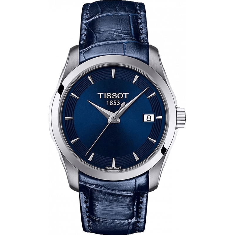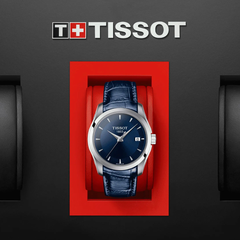 T035.210.16.041.00 có đường kính 32mm, phù hợp với hầu hết kích thước cổ tay của phái đẹp. Mặt số màu xanh lam, các chi tiết cọc số, bộ kim màu bạc nổi bật. Tên thương hiệu, năm thành lập được đặt ở vị trí trung tâm của mặt số. Tại vị trí 3 giờ hiển thị lịch ngày.