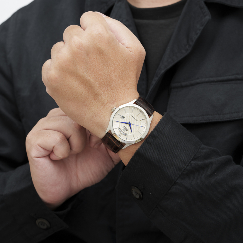 Thuộc dòng sản phẩm Orient, FEV0V004SH là một trong những mẫu đồng hồ ấn tượng nhất của thương hiệu đến từ xứ sở mặt trời mọc. Với ngoại hình đầy nam tính và sang trọng, cỗ máy của Orient hướng tới những người yêu thích sự mạnh mẽ và hiện đại. Mặt số màu trắng thanh lịch kết hợp với điểm nhấn là bộ kim màu xanh tạo nên một thiết kế đơn giản mà vẫn cực kỳ thu hút. Ô lịch thứ được làm dài và đặt ở vị trí 12h trong khi ô lịch ngày vẫn ở góc 3h quen thuộc. FEV0V004SH là phiên bản với dây da đen tương phản với phần vỏ núm màu bạc đồng bộ với cọc số dạng vạch khiến cho chiếc đồng hồ trở nên trẻ trung và dễ phối đồ hơn. Mô đen này được Orient trang bị bộ máy Cal.46E40 với 21 chân kính và khả năng trữ cót lên đến 40h. Ngoài ra, FEV0V004SH còn có kính cứng chịu lực, vỏ thép không gỉ cùng độ chịu nước lên đến 50m.