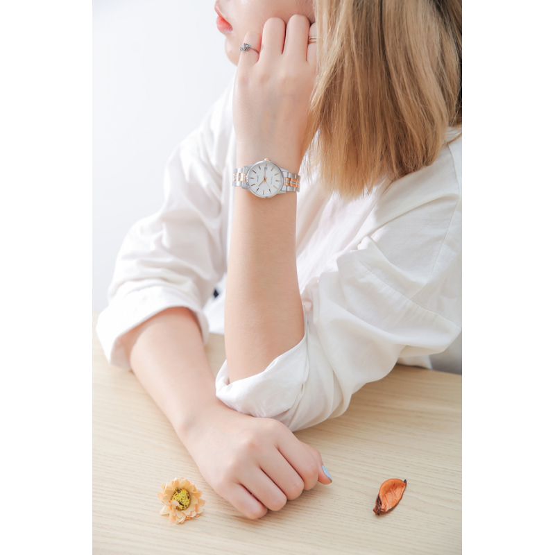 Thuộc dòng sản phẩm Orient, FUNG7001W0 là một trong những mẫu đồng hồ nữ đầy ấn tượng của thương hiệu đến từ xứ sở mặt trời mọc. Với ngoại hình thanh lịch và sang trọng, cỗ máy của Orient thực sự cuốn hút ngay từ cái nhìn đầu tiên. FUNG7001W0 sở hữu mặt số đường kính 32mm màu trắng thanh thoát. Bộ kim và cọc số mạ vàng đồng bộ với phần núm cùng dây kim loại demi tạo nên một thiết kế đơn giản mà vẫn cực kỳ thu hút. Ô lịch ngày như thường lệ được đặt ở góc 3h. FUNG7001W0 được Orient trang bị bộ máy Cal.HT711 cùng kính sapphire chống xước. Ngoài ra, mẫu đồng hồ này còn có vỏ và dây từ thép không gỉ cùng độ chịu nước lên đến 50m.