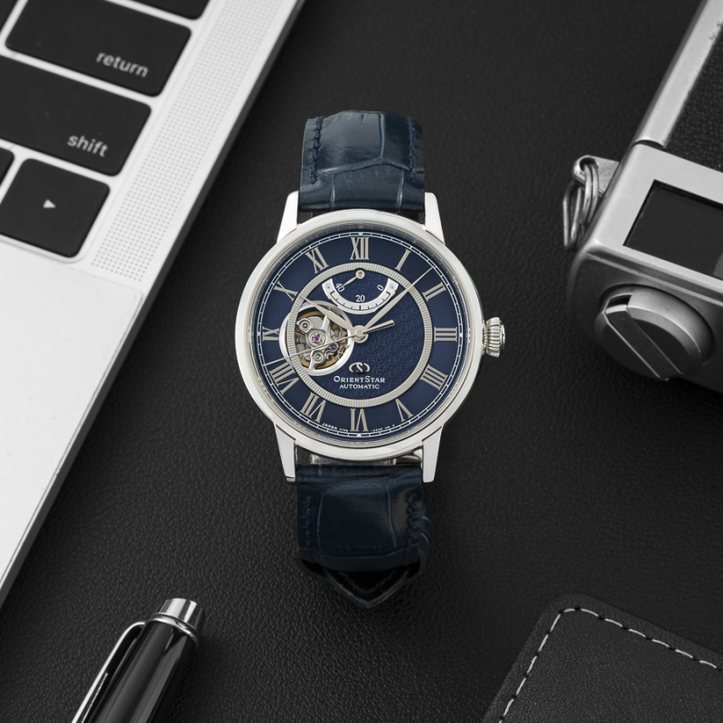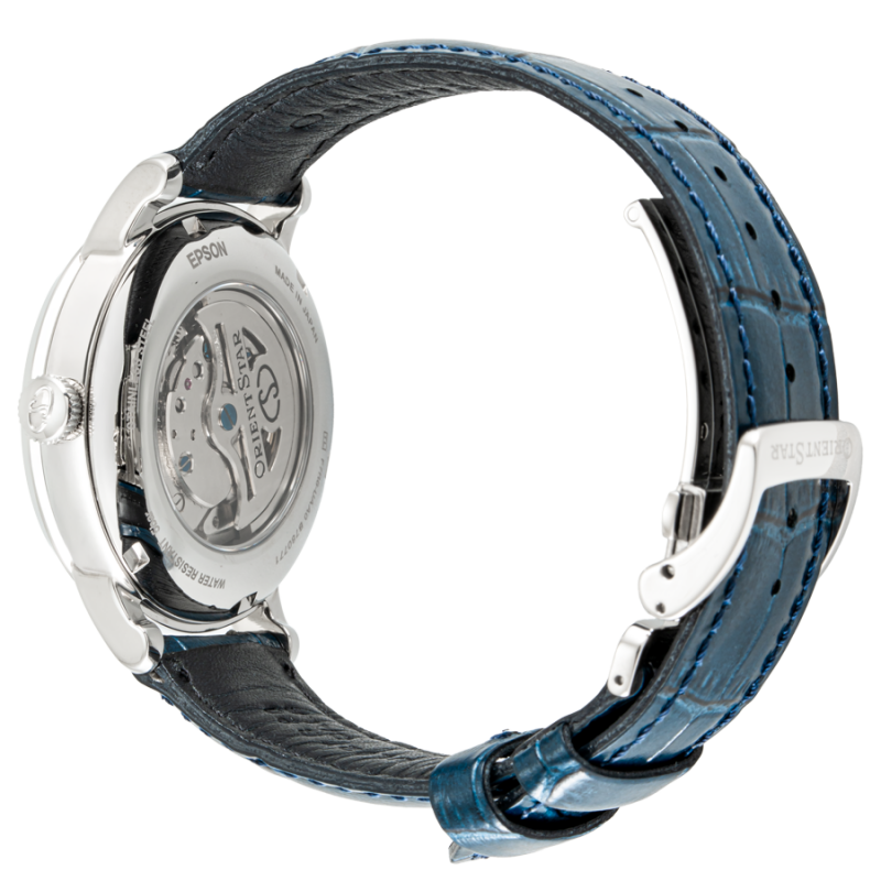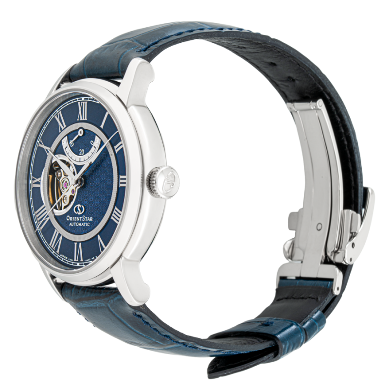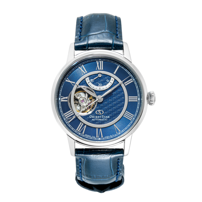 Thuộc dòng sản phẩm Orient Star, RE-HH0002L00B là một trong những mô đen bán chạy nhất của Orient. Với sự kết cấu lộ tim và kim xăng đo năng lượng, Orient vừa khoe được cỗ máy cơ khí in-house do hãng tự sản xuất ở vị trí 9h vừa tạo nên ấn tượng về thiết kế cao cấp vốn thường thấy ở những hãng đồng hồ Thụy Sỹ danh tiếng. Đồng thời, RE-HH0002L00B còn ghi điểm với vẻ ngoài đầy hiện đại với tông xanh chủ đạo của mặt số phối hợp với phần vỏ bạc gợi nên sự trẻ trung đầy mạnh mẽ. Bộ kim dáng mảnh, thon dài màu bạc kết hợp với cọc số La Mã khiến cỗ máy thời gian vẫn giữ nguyên được chất cổ điển vốn có của thương hiệu đến từ xứ sở mặt trời mọc. Mẫu Orient Star này được nhà sản xuất ưu ái trang bị bộ máy Cal.F7R62 đầy mạnh mẽ với 22 chân kính, chức năng lên cót tay và trữ cót lên đến 40h. Ngoài ra, RE-HH0002L00B cũng có kính sapphire chống phản quang, mặt đáy trong suốt giúp quan sát bộ máy bên trong, vỏ thép không gỉ 316L, dây da dập vân cá sấu cùng độ chịu nước 50m.