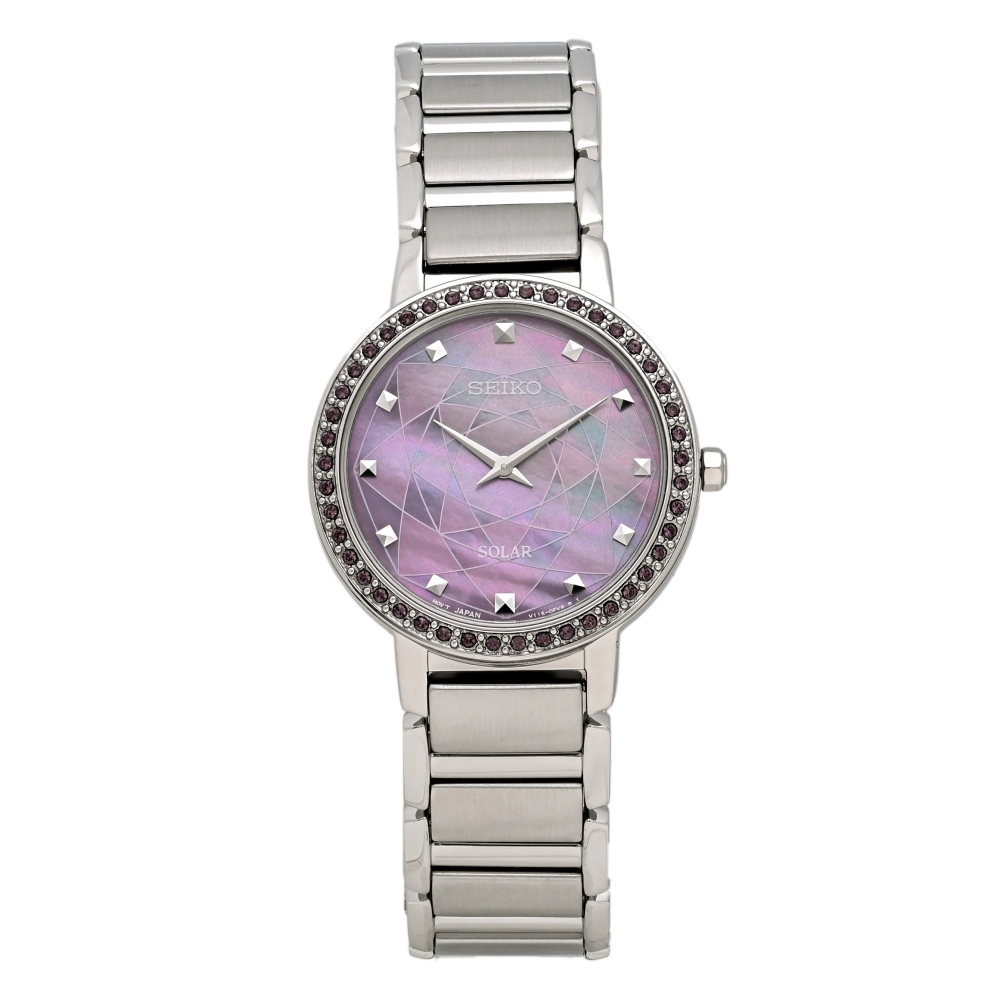 Các chất liệu làm đồng hồ Seiko nữ đều là những chất liệu tốt và phù hợp với tiêu chuẩn đồng hồ Thụy Sỹ như mặt kính sapphire chống xước, thép không gỉ tiêu chuẩn 316L, độ chịu nước cao,… Để đáp ứng nhu cầu của thị trường và thị hiếu của khách hàng nữ, Seiko liên tục làm mới mình và cải tiến các mẫu mã đồng hồ nữ của mình. Cũng giống như những món đồ trang sức đắt giá, đồng hồ Seiko nữ cũng được những nhà thiết kế dày công suy nghĩ ý tưởng mẫu mã. Phát huy truyền thống đó, Seiko SUP453P1 xứng đáng là một phụ kiện rất thanh lịch và đồng thời cũng rất tinh tế trên cổ tay của mọi phái đẹp. Điểm nhấn độc đáo nhất của SUP453P1 chính là mặt số được thiết kế mang họa tiết mandala vừa lạ mắt, vừa bí ẩn. Bên cạnh đó, Seiko cũng đã rất tỉ mỉ khi đính 45 viên đá hồng tím lấp lánh bao quanh mặt số giúp tôn lên sự sang trọng cho tổng thể. Không chỉ về ngoại hình, SUP453P1 cũng được chú trọng đến chất liệu như bộ vỏ và dây đeo bằng thép không gỉ 316L cao cấp, mặt kính độc quyền Hardlex Crystal có khả năng chống rạn nứt và trầy xước cao. Ngoài ra, chức năng Solar đã mang đến cho SUP453P1 những ưu điểm đặc biệt so với những chiếc đồng hồ cơ hay quartz như nạp pin siêu nhanh, không lo hết pin hay giảm thiểu chi phí thay pin bởi chỉ cần mất một vài phút tiếp xúc với ánh sáng, SUP453P1 đã đủ năng lượng để hoạt động trong nhiều giờ đồng hồ. Kiểu dáng trẻ trung, quý phái mà SUP453P1 sở hữu chắc chắn sẽ là món phụ kiện ưa thích của nhiều chị em phụ nữ.