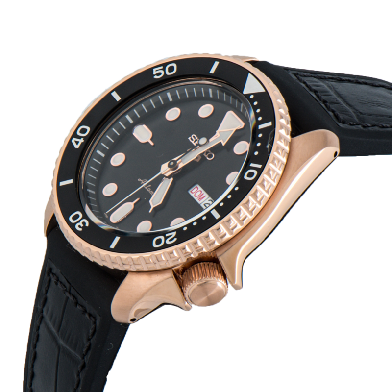 Chiếc đồng hồ Seiko 5 Sport SRPD76K1S được thiết kế với một phong cách hoàn toàn mới, trẻ trung và hiện đại. Mang hình hài của một chiếc đồng hồ lặn thể thao, chiếc SRPD76K1S sở hữu mức độ chịu nước ấn tượng lên tới 10ATM. Toàn bộ vỏ của chiếc đồng hồ được làm từ thép chống gỉ 316L cao cấp, được mạ vàng hồng bằng công nghệ mạ PVD hiện đại bậc nhất hiện nay. Núm vặn ren được đặt tại vị trí 4h tương đối phá cách giúp chống nước hiệu quả hơn. Phía bên trong mặt số là một nền màu đen tuyền, nó được trang điểm bằng những chi tiết phủ dạ quang cỡ lớn đồng thời cũng được mạ viền quanh màu vàng hồng làm tăng vẻ đẹp thẩm mỹ lên rất nhiều. Vành Bezel xoay đơn hướng màu đen bên ngoài trở nên rất nổi bật và bắt mắt với những vạch số màu trắng.