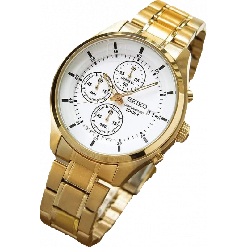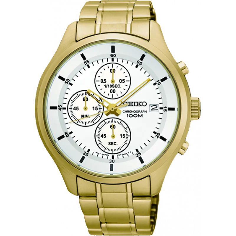 Chiếc đồng hồ Seiko Chronograph SKS544P1 được thiết kế với một phong cách thể thao hoàn toàn mới, trẻ trung và hiện đại. Mang hình hài của một chiếc đồng hồ bấm giờ với 3 núm chỉnh giờ, chiếc SKS544P1 sở hữu mức độ chịu nước ấn tượng lên tới 10ATM. Qua đó, chủ nhân của chiếc đồng hồ thậm chí vừa bơi vừa đeo đồng hồ vẫn sẽ không gặp bất kỳ vấn đề gì. Toàn bộ vỏ của chiếc đồng hồ được làm từ thép chống gỉ 316L cao cấp, mạ vàng PVD trông rất sang trọng. Phía bên trong là một mặt số màu trắng thanh thoát với 6 cây kim mạ vàng. Các đồng hồ con của chức năng Chronograph được xếp theo chiều dọc của mặt số đồng hồ. Chức năng đó cho phép người dùng đo được chính xác lên đến 1/10 giây. Rất ấn tượng!