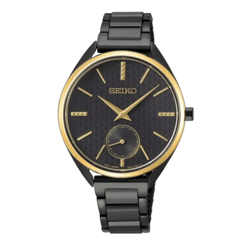 Rất ít những sản phẩm đồng hồ sử dụng tông đen bởi tông màu khó thiết kế, đòi hỏi nét hoàn thiện cao cũng như khá kén chọn cổ tay người đeo. Tuy nhiên, với nhà sản xuất đồng hồ đẳng cấp số 1 như Seiko, không gì là không thể, đỉnh cao của vẻ đẹp đồng hồ Nhật Bản luôn hiện hữu trên từng sản phẩm của Seiko, trong đó, không thể không nhắc tới SRKZ49P1, chiếc đồng hồ được đông đảo phụ nữ Nhật và cả trên thế giới yêu thích và tin dùng. SRKZ49P1 sở hữu phong cách chế tác độc đáo kiểu dáng thời trang, sang trọng với đặc trưng chủ đạo là 2 màu vàng và đen. Vỏ, dây cùng nền mặt số sử dụng tông đen nhám kết hợp với tông vàng ở cọc số và bộ kim qua công nghệ mạ cao cấp PVD. Mặt số được thiết kế đơn giản với kim vát nhọn đặc trưng cùng cọc số vạch, họa tiết Guilloche lặp đi lặp lại tạo nét thu hút, ấn tượng khi quan sát.