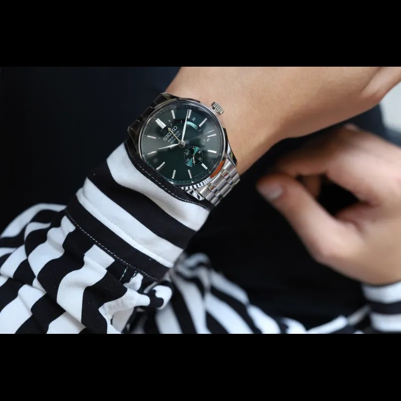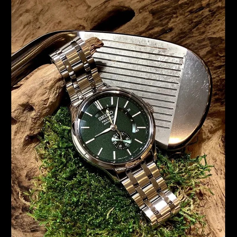 Nằm trong dòng sản phẩm Seiko Presage, mẫu đồng hồ nam Seiko SSA397J1 có thiết kế độ dày vừa phải cùng tông màu trắng thép thanh lịch từ phần vỏ đến dây kim loại. Gây chú ý đặc biệt nhất chính là các chi tiết sử dụng tông nền xanh lá độc đáo, bắt mắt. Đây là tông màu được khá ít nhà sản xuất đưa vào chế tác bởi tính phức tạp, đòi hỏi thiết kế đồng hồ đạt đến độ hoàn thiện cao, kiểu dáng phải phù hợp với màu. Nét tinh tế thể hiện từ các chi tiết vạch số, bộ kim được vát nhọn, chức năng hiển thị Power Reserve tiện ích cùng kim phụ chỉ ngày góc 6h giúp người sử dụng dễ dàng bao quát thời gian và năng lượng tích trữ trong đồng hồ.