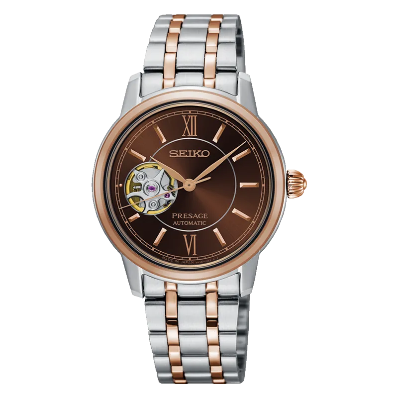 SSA808J1 là mẫu đồng hồ đáng chú ý nhất trong dòng sản phẩm Seiko Presage với thiết kế tinh xảo từ các chi tiết đường nét cọc số và bộ kim hiển thị, cách phối màu tinh tế khi sử dụng tông nâu trầm ở mặt kết hợp với nét vàng hồng ở vành và núm, khung hiển thị Open Heart độc đáo.