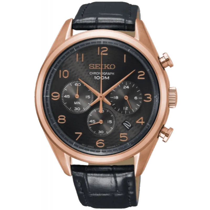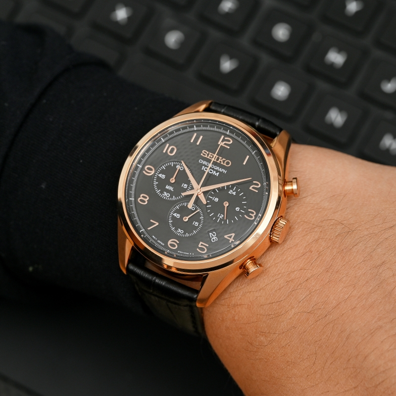 Chiếc đồng hồ Seiko Chronograph SSB296P1 được thiết kế với một phong cách thể thao hoàn toàn mới, lịch lãm và hiện đại. Mang hình hài của một chiếc đồng hồ bấm giờ với 3 núm chỉnh giờ, chiếc SSB296P1 sở hữu mức độ chịu nước ấn tượng lên tới 10ATM. Qua đó, chủ nhân của chiếc đồng hồ thậm chí vừa bơi vừa đeo đồng hồ vẫn sẽ không gặp bất kỳ vấn đề gì. Toàn bộ vỏ của chiếc đồng hồ được làm từ thép chống gỉ 316L cao cấp, được mạ vàng hồng bằng công nghệ PVD vô cùng tinh tế. Phía bên trong là một mặt số màu đen nam tính với bộ hiển thị 6 kim cũng được mạ vàng hồng tuyệt đẹp, cọc số Arab với font chữ cách điệu giúp tính thẩm mỹ của chiếc đồng hồ trở nên trẻ trung, thanh thoát hơn rất nhiều. Các đồng hồ con của chức năng Chronograph được xếp theo chiều ngang của mặt số đồng hồ. Ngoài ra chiếc đồng hồ còn có tính năng chỉ lịch ngày và giờ 24 cũng rất hữu ích.