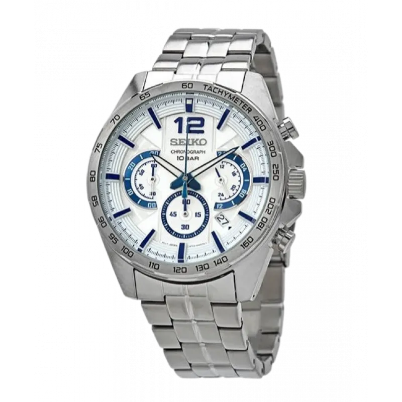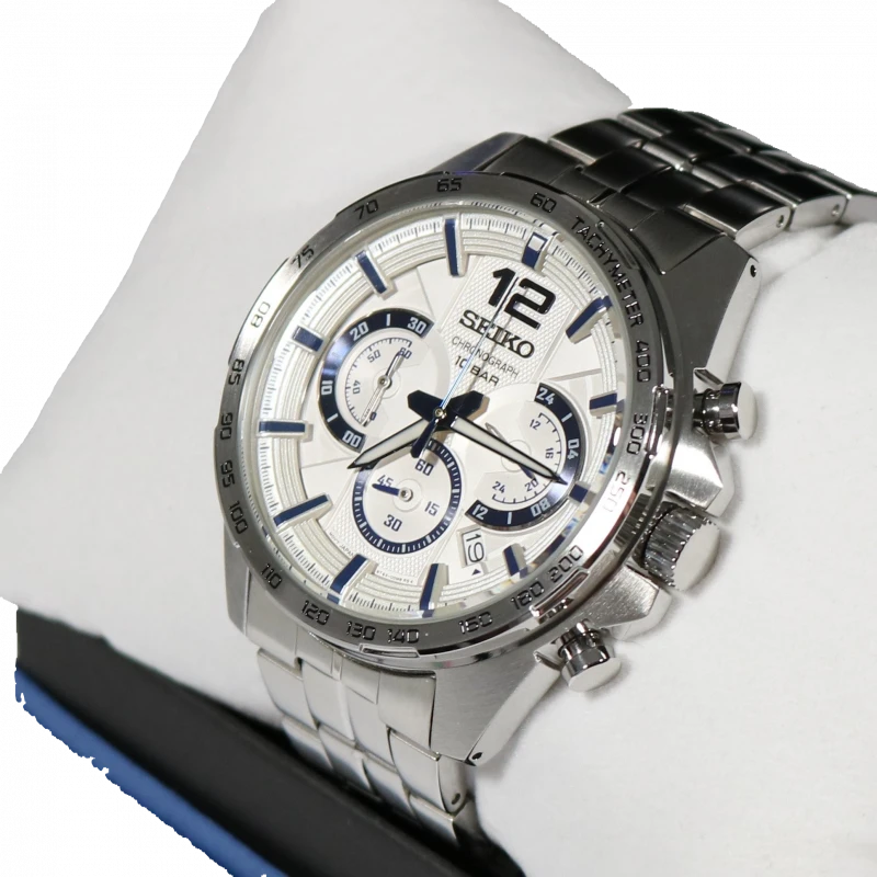 Chiếc đồng hồ Seiko Solar SSB343P1 sở hữu đường kính 43,9mm cùng độ dày 12.9mm, thích hợp với những người thường xuyên vận động thể thao. Lớp vỏ và dây đeo của chiếc đồng hồ được làm từ thép chống gỉ 316L với độ sáng bóng và bền bỉ cực cao. Về mặt thiết kế, chiếc SSB343P1 với mặt số trắng nổi bật lên bộ hiển thị được mạ màu xanh trẻ trung, bắt mắt, hiển thị giờ chính và chức năng hiển thị phụ Chronograph độc đáo, vành bezel thể hiện chức năng Tachymeter giúp người sử dụng đo lường được vận tốc di chuyển trên một quãng đường.
