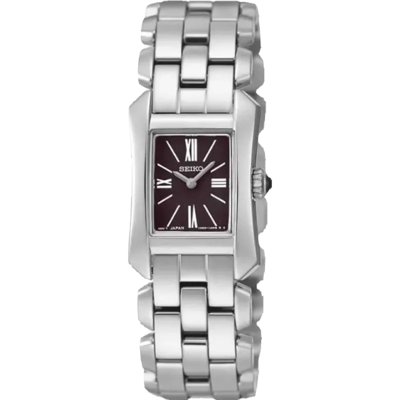 Nằm trong bộ sưu tập đồng hồ nữ thời trang của Seiko, đồng hồ SUJG71P1 có kiểu dáng khá độc đáo và lạ mắt với thiết kế giống một chiếc vòng trang sức đi kèm tông màu thép bóng bắt mắt. Vỏ vuông nối liền với dây đồng hồ được làm từ thép không gỉ cao cấp 316L, mặt kính cứng không chỉ riêng khả năng chống lực va chạm tối ưu mà còn giúp tăng tính thẩm mỹ và độ hoàn thiện của sản phẩm. Mặt số được thiết kế đơn giản với tông nâu đỏ trang nhã, 2 kim chỉ giờ và phút, sử dụng cọc số La Mã truyền thống kết hợp số vạch.