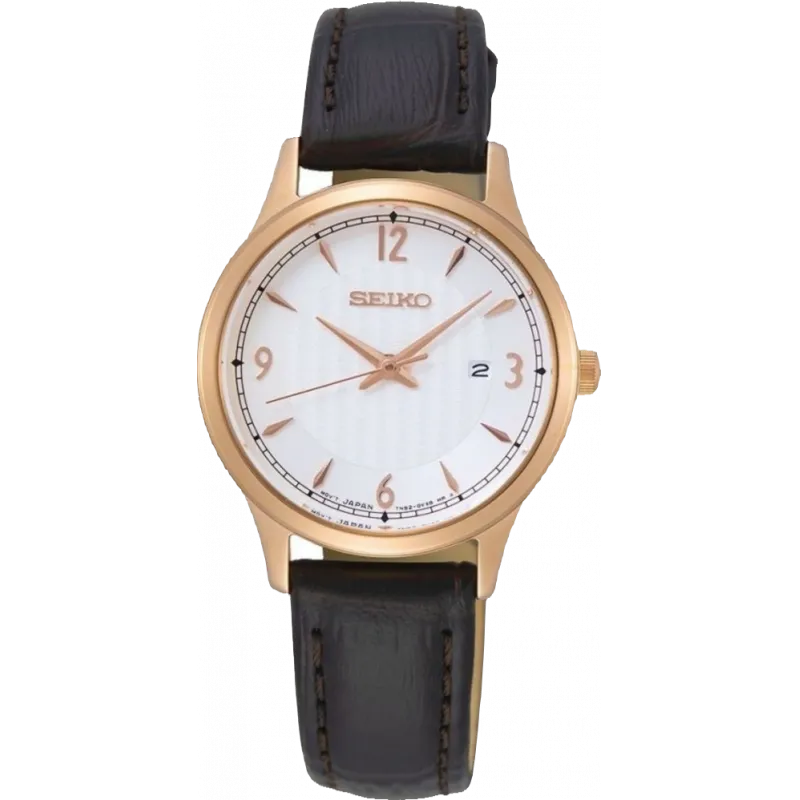 Chiếc đồng hồ Seiko SXDG98P1 được thiết kế với một phong cách thanh lịch và trẻ trung. Mặt số màu trắng cùng những hoa văn rất tinh tế kết hợp cùng với những cọc số và bộ kim mạ vàng hồng vô cùng nổi bật và dễ nhìn. Ô cửa sổ lịch ngày được đặt ở vị trí truyền thống 3h rất thuận mắt. Trong khi đó, lớp vỏ bên ngoài được làm từ thép chống gỉ 316L mạ vàng hồng PVD có độ bền rất cao, được đánh bóng rất tỉ mỉ qua tay những người thợ chế tác Nhật Bản. Đi kèm với đó là bộ dây da nâu vân cá sấu càng tăng sự sang trọng của chiếc đồng hồ.