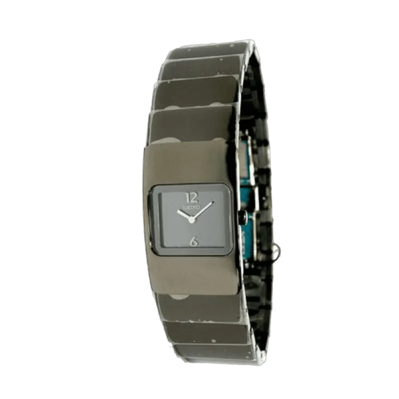 Nằm trong bộ sưu tập đồng hồ nữ thời trang của Seiko, SYL819P1 có kiểu dáng khá độc đáo và lạ mắt với thiết kế giống một chiếc vòng trang sức đi kèm tông màu đen bóng huyền bí. Vỏ vuông nối liền với dây đồng hồ được làm từ thép không gỉ cao cấp 316L, mặt kính cứng không chỉ riêng khả năng chống lực va chạm tối ưu mà còn giúp tăng tính thẩm mỹ và độ hoàn thiện của sản phẩm. Mặt số được thiết kế đơn giản với tông đen cùng tông với vỏ và dây, 2 kim chỉ giờ và phút, sử dụng cọc số chỉnh ở 2 múi giờ 6 và 12.