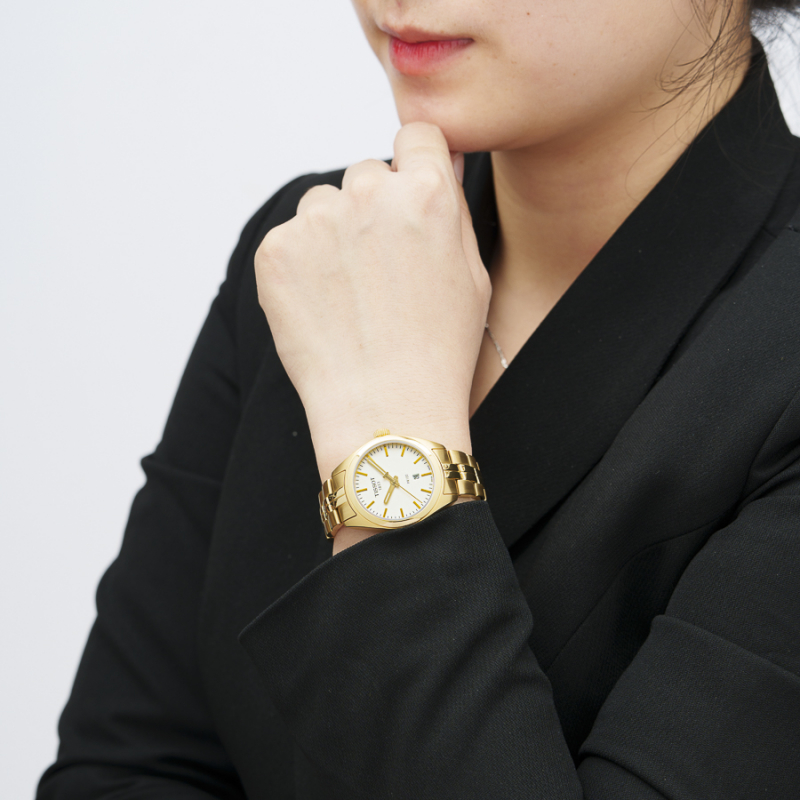Đồng hồ sở hữu bộ vỏ và dây đeo chế tác từ thép không gỉ 316L cao cấp, thân thiện với da tay, mạ PVD vàng sang trọng.