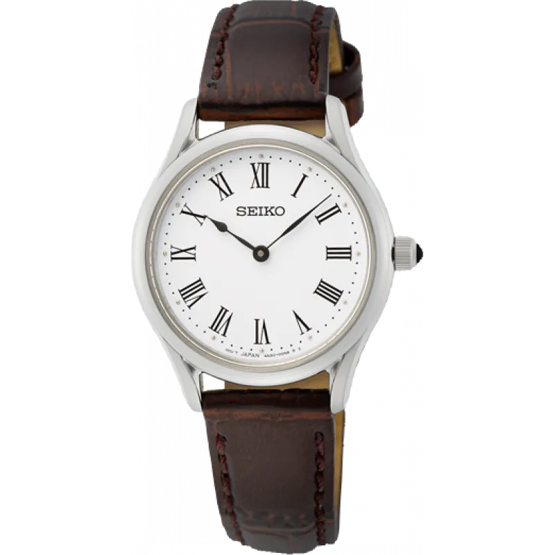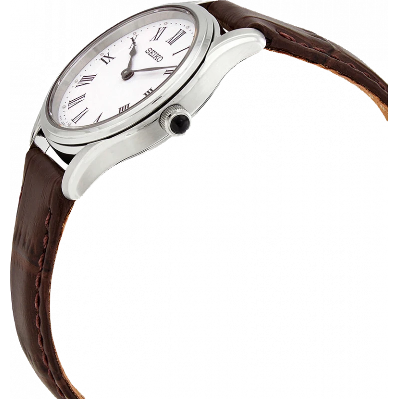 Các chất liệu làm đồng hồ Seiko nữ đều là những chất liệu tốt và phù hợp với tiêu chuẩn đồng hồ Thụy Sỹ như mặt kính sapphire chống xước, thép không gỉ tiêu chuẩn 316L, độ chịu nước cao,… Để đáp ứng nhu cầu của thị trường và thị hiếu của khách hàng nữ, Seiko liên tục làm mới mình và cải tiến các mẫu mã đồng hồ nữ của mình. Nằm trong dòng sản phẩm Regular, SWR071P1 là mẫu đồng hồ dành cho phái đẹp với thiết kế đơn giản, thanh lịch. Bộ case của SWR071P1 chế tác từ thép không gỉ 316L với đường kính mặt số 29.9mm phù hợp với mọi cổ tay phái đẹp. Dial của sản phẩm cũng được lược giản tối đa các chi tiết, chỉ giữ lại bộ kim đen và các cọc số La Mã cổ điển nổi bật trên nền dial trắng. SWR071P1 được trang bị kính sapphire chống xước, bộ máy 4N30 hoạt động nhờ năng lượng pin với độ bền bỉ và chính xác cao. Dây đeo bằng da cao cấp, thấm hút mồ hôi tốt giúp chủ nhân luôn thoải mái trong quá trình sử dụng. Ngoài ra, thiết kế đồng hồ có độ chống nước lên tới 5ATM, bảo vệ tốt cho cỗ máy trong mọi sinh hoạt hàng ngày.