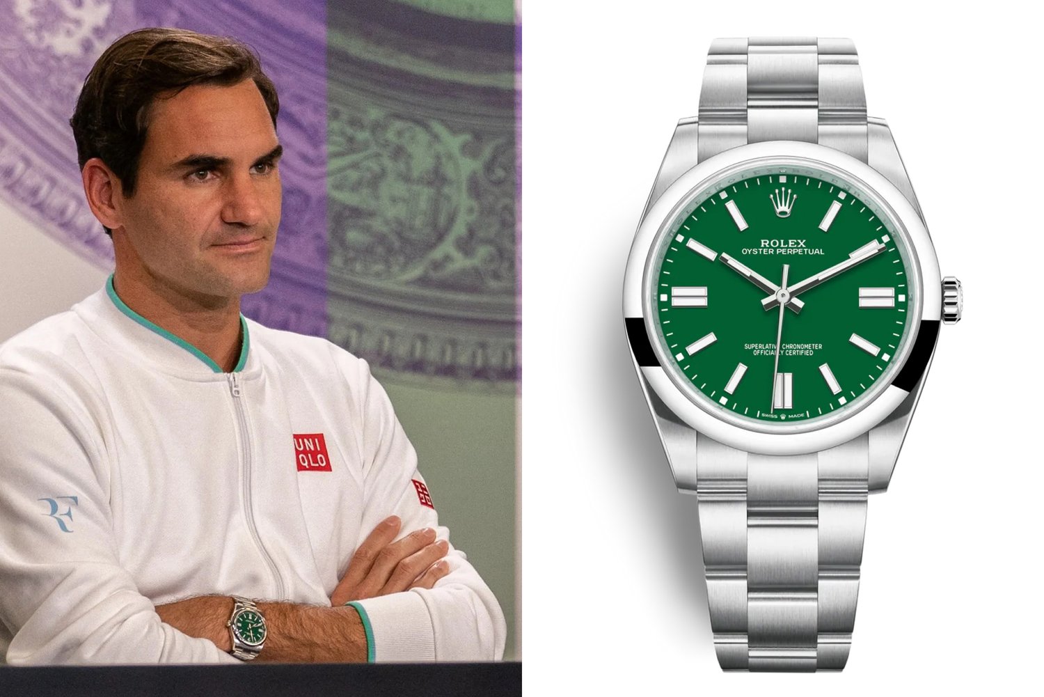 Có thể nói bộ sưu tập Rolex của Federer cũng đi từ những phân khúc thấp (entry-level) tới những phân khúc vô cùng cao cấp. Trong vài năm gần đây, ta có thể bắt gặp hình ảnh tay vợt Thụy Sĩ đeo trên tay mẫu Rolex Oyster Perpetual size mặt 41mm với phối màu xanh lá trẻ trung - Ref. 124300.