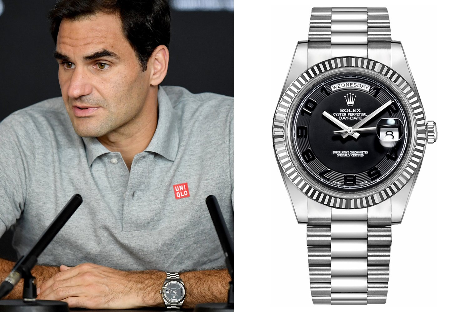 Một trong những mẫu Rolex vô cùng ấn tượng trong bộ sưu tập của Roger Federer đó là Day-Date Platinum Ref. 218206. Đây là một phiên bản Day-Date mà Rolex đã ngừng sản xuất được làm từ chất liệu Platinum cao cấp, có mặt số đen bí ẩn.