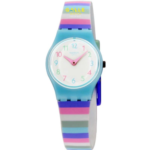 Swatch LL121 là mẫu đồng hồ điện tử nhỏ nhắn, được thiết kế riêng cho học sinh cấp 1. Mặt số có đường kính khoảng 25mm rất vừa tay các bé nhỏ với dial trắng kết hợp đường kẻ sọc màu sắc tươi sáng cùng cọc số cầu vồng và bộ kim hồng dễ thương. Dây đeo bằng silicon mềm mại, nhẹ nhàng, giúp trẻ em đeo trong ngày dài mà không bị khó chịu. Khả năng chống nước đạt 3 ATM, phù hợp khi bé rửa tay hoặc đi mưa nhỏ. Đây là lựa chọn rất đáng cân nhắc nếu bố mẹ muốn một chiếc đồng hồ dễ thương, bền, phù hợp với lứa tuổi nhỏ.