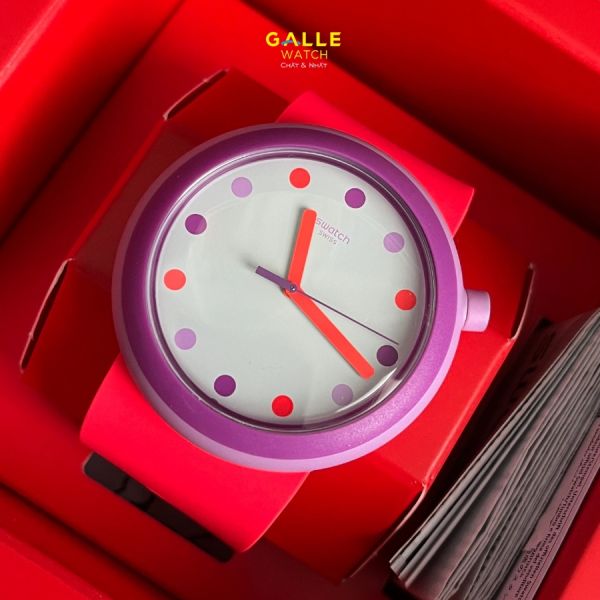 PNP100 POP POPALICIOUS mang phong cách ngọt ngào và trẻ trung, là một trong các mẫu Swatch POP nổi bật. Cọc số trên mặt đồng hồ như những viên kẹo màu sắc, kim đỏ nổi bật tạo điểm nhấn dễ thương. Dây đeo plastic nhẹ, máy Swiss quartz chuẩn, chống nước 3 ATM đủ để bé chơi ngoài trời, đi mưa nhẹ mà không lo bị hỏng máy. Thiết kế này hợp với những bé thích màu sắc và kiểu dáng vui nhộn.